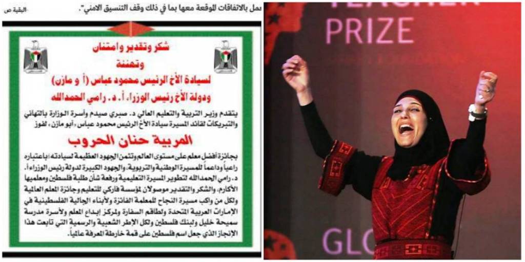 في صفحتها الأولى، نشرت صحيفة القدس الفلسطينية، في عددها الصادر، أمس الثلاثاء، تهنئة للرئيس محمود عباس ورئيس الوزراء رامي الحمدالله، مقدمة من وزير التربية والتعليم صبري صيدم، أما المناسبة، فهي فوز المعلمة حنان الحروب بلقب “أفضل معلم في العالم لعام 2016” إلى جانب الجائزة المالية وقدرها مليون دولار.