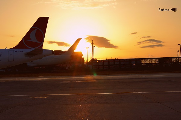 حان وقت السفر، تسلّم كلٌ منّا رقم مقعده في الطائرة، ودخلنا السرداب المؤدي للطائرة، الذي يشبه التصاقه ببوابة الطائرة، القُبلة، كما يبدو لي من زجاج النافذة، أمّا تعرّجاته في الغلاف الخارجي، منحتني شعورًا مرتبكًا، كأن السرداب معلق في الهواء غير ثابت، وقد يقع في أي لحظة إذا ما مشينا جميعنا فيه، وسرعان ما تخلّصت من هذه المشاعر حال سيري فيه، حتى وصلنا الطائرة، ودخلتها أخيرًا، تنتظرنا المضيفات التركيات بابتساماتهن المرفقة بــ”Good Morning” تمام الثالثة وربع فجرًا.