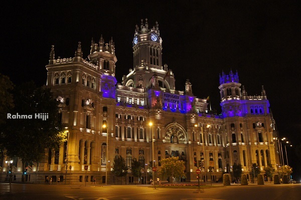 ومن أبرز معالم مدريد التي مررت بها في تلك المسافة: بويرتا دي أوروبا (The gate of Europe) وهذا الاسم الحديث لبرجين متقابلين متناظرين في الشكل، بينما اسمهما الأول “Torres KIO” . و”Caja Madrid Obelish” وهي مسلة مثل مسلات الفراعنة لكنها هنا ذهبية اللون، ومستوحاة –وفق ويكيبيديا- من “العمود الذي لا نهاية له” الروماني، مرورًا بعدد من الميادين والنوافير على هيئة تماثيل لم أتوصّل لأسمائها جميعًا، حتى الوصول إلى مبنى البلدية (Cybele Palace) أو ما يُعرف بـ”قصر الاتصالات”، ولفتت انتباهي لوحة كبيرة معلقة عليه ترحب باللاجئين “Refugees Welcome”، إضافة إلى “”Puerta de Alcalá وهو صرح يشبه في تصميمه قوس النصر في فرنسا، لكن بأقواس عدة.